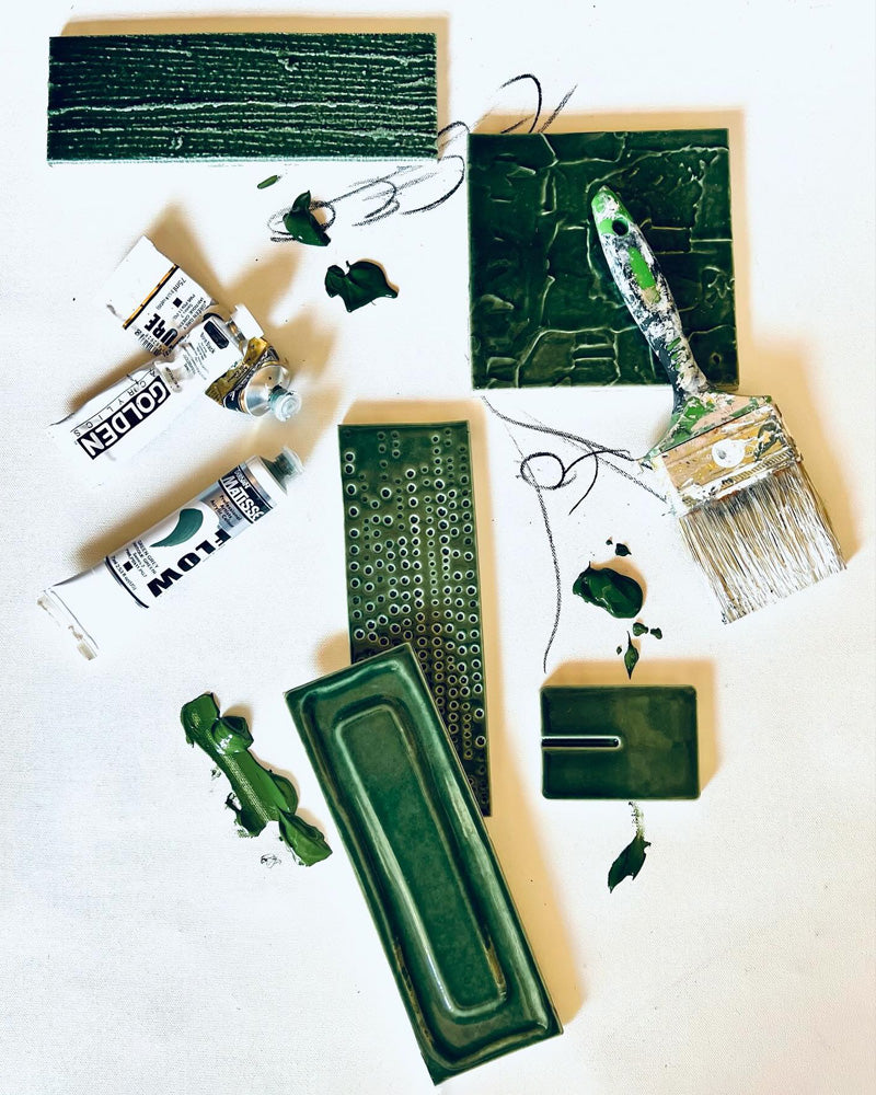 Inspired by original acrylic paintings, these tiles showcase textural reliefs that mimic thick gesso applications and brush strokes, creating a dynamic interplay of texture and dimension.